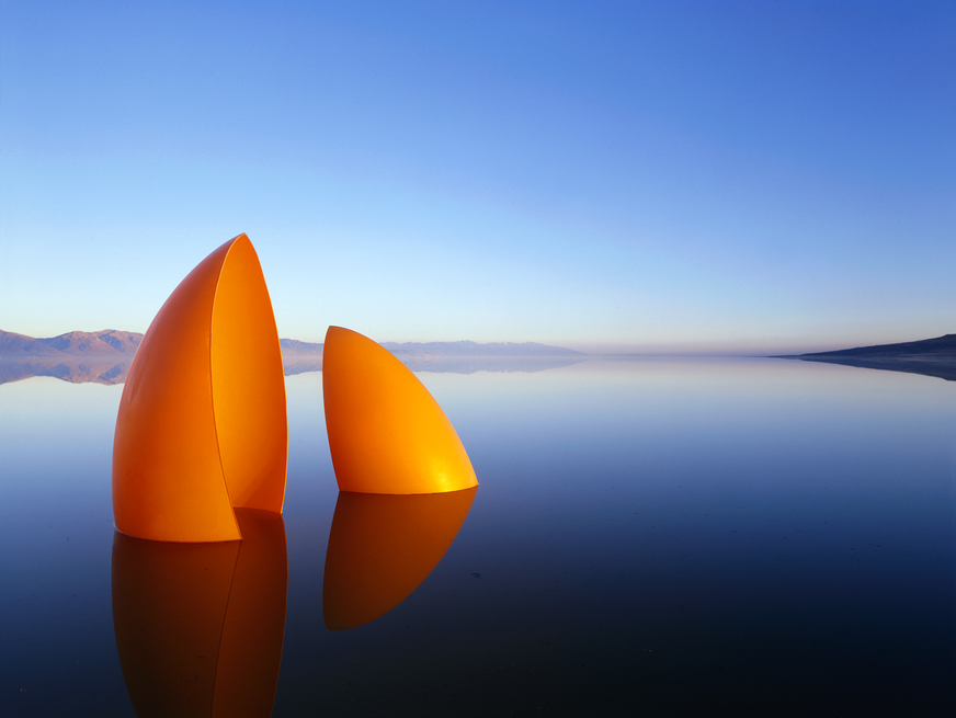 2 orange pod shapes is a placid body of water creating a surreal landscape of serenity. Print is color Fuji Crystal Archival print material bonded to a sheet on aluminum fluch to edges and ready to hang. Approx size 30"x40"