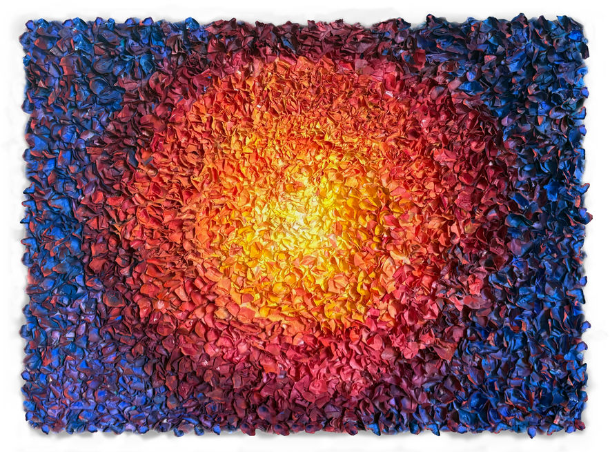 Sun begins where all energy originates — at the center. The canvas is raised in two concentric ripples, built petal by petal from thousands of individually torn and folded sheets of Mulberry, Kozo, tissue, and handmade paper. From this luminous core, color radiates outward in an unbroken gradient: molten yellow at the heart, deepening through orange and red, cooling into deep cobalt and violet at the edges — the full spectrum of a sun witnessed from rise to atmosphere.