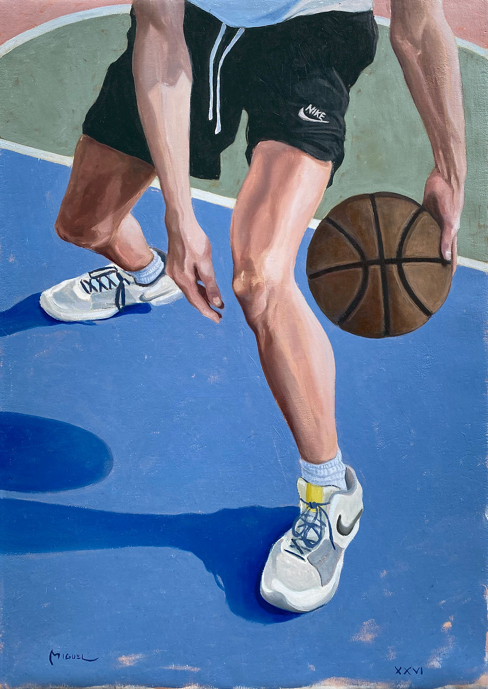 Oil painting on canvas, measures 48 X 36 inches, gallery wrapped around 1.5 inch deep stretcher bars with edges painted deep maroon